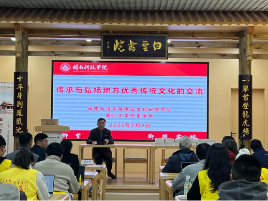 2026年1月8日晚我校南安文化研究中心与厦门大学历史学系在白云书院举行传承和弘扬地方优秀传统文化交流会,我校参加人员有南安文化研究中心主任邱永渠教授、人文学院院长曹养元副教授、人文学院陈雅谦教授、人文学院中文系主任戴丽玲副教授、马克思主义学院余海涛讲师、图书馆馆长杨福进副研究馆员等;厦大历史学系参加的有历史学系教授、人文与艺术学部主任郑振满教授、历史学系黄向春教授、饶伟新副教授、郑莉副教授和加拿大麦吉尔大学东亚系融道副教授、荷兰莱顿大学区域研究学院林凡二级讲师和厦门大学2023级历史学专业参加社会实践的同学。